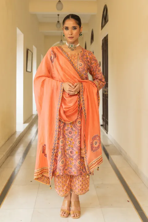 shop vishnu's elegant long kurta made from soft Muslin fabric, featuring handblock prints and zari embroidery. Perfect for festive occasions and effortless style.