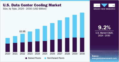 The global data center cooling market size is expected to reach USD 56.15 billion by 2030, growing at a CAGR of 16.8% from 2024 to 2030, according to a study conducted by Grand View Research, Inc. The market is expected to witness substantial growth on account of the need for enhanced cooling techniques to negate the scorching heat due to rising global temperatures. An increasing number of data center facilities worldwide is fueling market growth. In addition, a gradual shift toward cloud services is creating a rise in demand for eco-friendly cooling technology. Favorable initiatives by governing bodies across the globe that are focused on promoting cloud proliferation are driving demand for data centers, subsequently developing the sense of direction for the data center cooling industry.