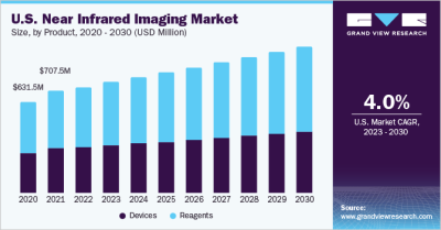 The global near infrared imaging market size is expected to reach USD 2.82 billion by 2030, registering a CAGR of 3.9% from 2023 to 2030, according to a new report by Grand View Research, Inc. Growing usage of near infrared (NIR) fluorescence imaging due to the advantages, such as minimally invasiveness and high efficiency in diagnosing various conditions, is anticipated to drive the industry growth significantly during the forecast period. Moreover, growing incidences of chronic disorders, especially among the geriatric population, are fueling industry growth. Alzheimer’s disease, dementia, arthritis, chronic kidney disease, cancer, Cardiovascular Diseases (CVDs), and diabetes are some of the commonly prevalent diseases that require NIR imaging for better diagnosis and further decision-making for effective treatment.