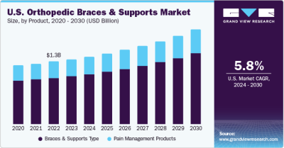 The global orthopedic braces and supports market size is expected to reach USD 7.01 billion by 2030 and is expected to expand at a CAGR of 7.0% over the forecast period, according to a new report by Grand View Research, Inc. Key factors propelling the market growth include the growing incidence of injury & trauma, the prevalence of chronic diseases such as rheumatoid and osteoarthritis and increasing technological advancements. For instance, in March 2023, Aspen Medical Products, a mobility and pain management solutions provider, partnered with NICE Recovery Systems (NICE) to launch integrated bracing and cold compression solutions for pain management and post-operative care to patients recovering from surgery or injury.