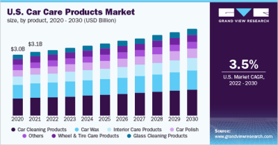 The global car care products market size is expected to reach USD 14.1 billion by 2030 and is expected to expand at a CAGR of 3.6% from 2022 to 2030, according to a new report by Grand View Research, Inc. This growth is attributed to the increasing consumer awareness regarding vehicle repair and maintenance.