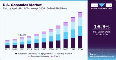 The global genomics market size is expected to reach USD 94.86 billion by 2030, according to a new report by Grand View Research, Inc. The market is expected to register a CAGR of 16.5% in the forecast period owing to the increasing demand for novel therapeutic and research applications in genomics. Moreover, it is extensively used for a wide variety of applications, such as pharmacogenomics, and metagenomics. The emerging applications of genomics are braced up by industrial collaborations and expansions. For instance, in June 2020, Merck & Co., Inc., and 10x Genomics, Inc., collaborates to develop powerful genomics-based experiments to better understand the relationship between specific genes and disease by using 10x Genomics’ barcode technology to screen single cells using CRISPR libraries.