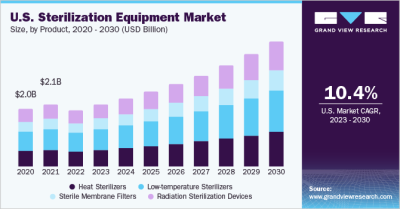 The global sterilization equipment market size is expected to reach USD 15.6 billion by 2030, registering a CAGR of 10.6%, according to a new report by Grand View Research, Inc. The rising incidence of Hospital Acquired Infections (HAIs), impact of the COVID-19 outbreak, and the increasing number of surgical procedures are the key driving factors of the market. The recent outbreak of COVID-19 is anticipated to significantly impact the market. The pandemic caused by the virus SARS-CoV-2 has drastically increased the demand for medicines, emergency supplies, and hospital equipment including gowns, antiseptics, and disinfectant products.