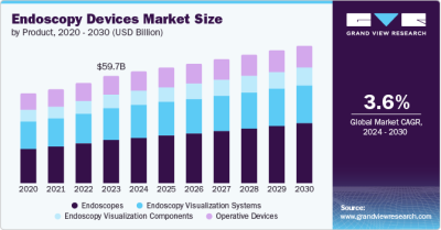The global endoscopy devices market size is expected to reach USD 76.41 billion by 2030, registering a CAGR of 3.58% from 2024 to 2030, according to a new report by Grand View Research, Inc. Healthcare systems worldwide are increasingly incorporating endoscopic procedures into their cancer management protocols for early detection & treatment of cancer to improve survival rates. This trend and the rising global cancer burden are expected to boost the demand for endoscopes, driving market growth. Moreover, manufacturers in the market are continuously innovating and expanding their endoscope product lines to meet the growing clinical needs, aiming to equip them with the most advanced technology for effective cancer treatment.