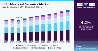 The global advanced ceramics market size is anticipated to reach USD 147.34 billion by 2030 and is anticipated to grow at a CAGR of 4.2% from 2024 to 2030, according to a new report by Grand View Research, Inc. The market growth is primarily driven by the increasing demand across various industries due to their superior properties, such as hardness, high strength, and thermal stability. The expanding electronics sector, where ceramics are essential for manufacturing components like capacitors and insulators, and the growing adoption of advanced ceramics in the automotive industry for manufacturing engine components and cutting-edge sensors will drive the market growth.
