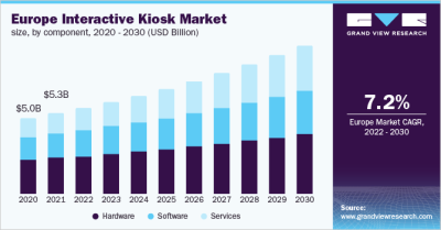 The global interactive kiosk market size is expected to reach USD 52.74 billion by 2030, registering a CAGR of 7.1% over the forecast period, according to a new study conducted by Grand View Research, Inc. Increasing consumer involvement in the purchase process and an extensive focus on customized service delivery by industry players are the major factors driving the adoption of interactive kiosks. The geographical expansion and service enhancement using interactive kiosks enable companies to offer convenient, swift, and hassle-free service to customers with enhanced safety and security. The North American regional market dominated the global market in 2021.