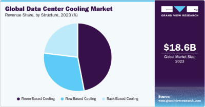 Rack, row, and room-based cooling are the major cooling types by structure. Of the three, room-based cooling captured a significant share in 2023 and the segment is expected to grow at a CAGR exceeding 15.0% from 2024 to 2030. The room-based cooling technique has become a widely used technique, resulting in a higher market share. The method is popular as it maintains adequate temperature by continuously mixing hot & cold air, ensuring the prevention of hot spots.