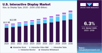 The global interactive display market was valued at USD 41.45 billion in 2022 and is projected to grow at a compound annual growth rate (CAGR) of 7.8% from 2023 to 2030. This market includes various products such as interactive kiosks, video walls, tables, monitors, and whiteboards. Interactive displays, also known as touchscreen displays, allow users to give commands through a finger or stylus, replacing traditional peripheral devices like a mouse or keyboard. These displays also project information in the form of text, images, and videos, and they are widely used across industries like retail, healthcare, hospitality, and education. The expected growth is primarily driven by the increasing demand for digital classrooms and the rising adoption of displays like video walls and tables, which are commonly used in public transportation spaces such as airports and railway stations.
