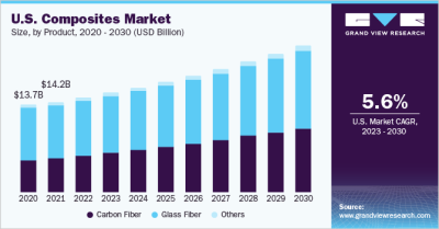 The global composites market was valued at USD 93.69 billion in 2022 and is projected to grow at a compound annual growth rate (CAGR) of 7.2% from 2023 to 2030. This growth is largely driven by the rising demand for lightweight components in the automotive and transportation sectors. The increasing use of advanced lightweight materials in manufacturing industries is also expected to fuel market expansion in the coming years.