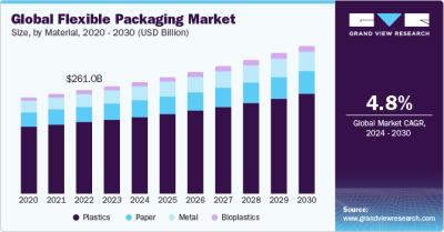 The global flexible packaging market was valued at USD 270.96 billion in 2023 and is expected to grow at a compound annual growth rate (CAGR) of 4.8% from 2024 to 2030. The rising demand for flexible packaging in the medical and pharmaceutical industries is a key driver of this growth. Flexible packaging offers several advantages, such as a variety of container types, reduced raw material usage, ease of disposal, and lightweight characteristics, which are anticipated to further drive demand throughout the forecast period.