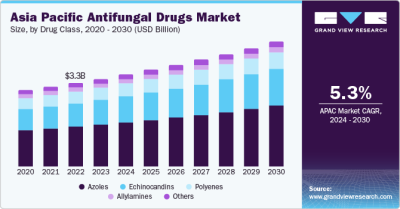 In 2023, the global antifungal drugs market reached an estimated value of USD 15.8 billion, with an anticipated compound annual growth rate (CAGR) of 3.8% from 2024 to 2030. The rising incidence of fungal infections like aspergillosis and candidiasis is a major driver of this market. Fungal infections include both systemic and superficial infections, affecting areas such as the skin, eyes, mouth, and vagina. Antifungal drugs, known for their fungicidal properties, are widely prescribed to treat conditions like athlete's foot, ringworm, and fungal meningitis. The increasing number of hospital-acquired infections and other infectious diseases is also expected to drive market growth over the forecast period.