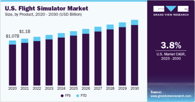 The global flight simulator market was valued at USD 5.18 billion in 2022 and is projected to grow at a compound annual growth rate (CAGR) of 4.2% from 2023 to 2030. Flight simulators provide several advantages, including mission-critical training programs that ensure the effective operation of aircraft, reduced operational costs, and sophisticated visual systems. These features create experiences that closely mimic real-world scenarios, paving the way for new growth opportunities in the market over the coming years. The increasing demand for more effective pilot training is expected to significantly boost market expansion, particularly in light of the growing emphasis on aircraft safety and the need for comprehensive training programs.