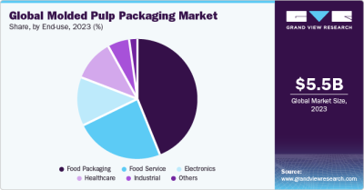 The electronics industry is expected to grow at a CAGR of 9.1% over the forecast period due to high demand for protective packaging for sensitive electronics like laptops, smartphones, and similar devices. Molded pulp packaging is essential in transporting and storing these delicate electronic items, safeguarding them from external damage, and driving the demand for molded pulp packaging solutions.