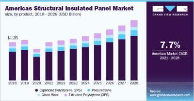 The Americas structural insulated panel market size is expected to reach USD 4.27 billion by 2028 registering a CAGR of 7.7% over the forecast period, according to a new report by Grand View Research, Inc. Favorable regulations and rising adoption of various green building standards are some of the key factors driving the market growth. Rising spending in the construction sector in North America due to the increasing government initiatives for the modernization of the infrastructure and energy-efficient homes and the rising number of green buildings in the U.S. and Canada is projected to drive the product demand.
