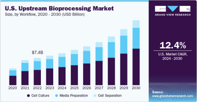 The global upstream bioprocessing market size is expected to reach USD 59.24 billion by 2030, registering a CAGR of 14.3% from 2024 to 2030, according to a new report by Grand View Research, Inc. Commercial success and wide acceptance of biopharmaceuticals have provided lucrative growth avenues to several in house as well as contract manufacturing biopharmaceutical companies. Furthermore, a confluence of factors, such as high demand for biosimilars and biologics, launch of improved cost-effective technologies, and growing acceptance of single-use systems have driven the revenue performance of the market.