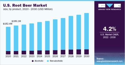 The global root beer market size is anticipated to reach USD 1.09 billion by 2030, registering a CAGR of 4.6% over the forecast period, according to a new report by Grand View Research, Inc. Root beer is a North American drink that’s been traditionally made using the root bark of the sassafras tree. Sassafras was banned by the Food and Drug Administration (FDA) in 1960 owing to the presence of safrole, a carcinogenic component. Thus, most commercial root beers available in the market contain the artificial flavoring of sassafras. However, some companies, such as Hansen Beverage, use safrole-free sassafras extract to retain the authenticity of root beer.