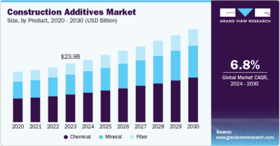 According to a recent report by Grand View Research, Inc., the global construction additives market is projected to reach USD 37.71 billion by 2030, growing at a compound annual growth rate (CAGR) of 6.8% from 2024 to 2030. Market expansion is expected to be fueled by increasing awareness among contractors, designers, and infrastructure developers about the benefits of construction additives. Additionally, their widespread application in residential and commercial building projects is set to support market growth.