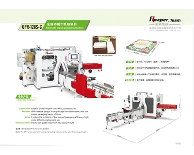 Automatic napkin wrapping machine OPR-128S-C is suitable for automatic plastic bag packaging with soft tissue, facial tissues,napkins, cotton tissues, etc.
