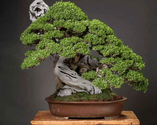Bonsai above is a yellow tree, which has been maintained and trained to become bonsai since the 1800s, and is now on display at the Montréal Botanical Gardens. The tree is very old, visible from the main trunk which is very large and porous.