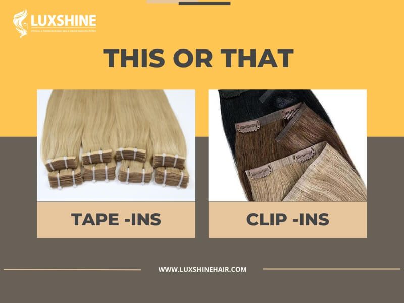 See more: https://luxshinehair.com/tape-in-vs-clip-in-hair-extensions/
